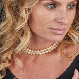 realizzata a doppio filo di perle di mm 9 circa, fermatura in oro giallo 18kt impreziosita da diamanti taglio brillante e carré per ct 0.70 circa, lungh. cm 36, gr. 83