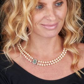 realizzata a doppio filo di perle digradanti di mm 9-6 circa, fermatura in oro bianco 18kt impreziosita da smeraldi taglio ottagonale e rotondo per ct 0.40 circa e diamanti taglio huit huit per ct 0.20 circa, lungh. cm 53, gr. 79