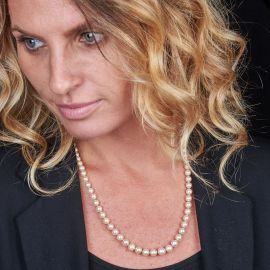 composta da un filo di perle digradanti di mm 8-4 circa, fermatura in oro bianco 18kt con un diamante centrale taglio brillante e piccoli diamanti taglio huit huit, lungh. cm 41, gr. 30