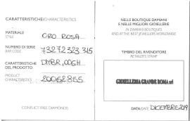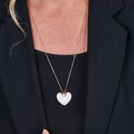 catena in oro rosa 18kt, con pendente a forma di cuore in ceramica bianca di dim. cm 2,5x2 circa con piccolo diamante taglio brillante, firmata "Damiani", punzoni 750 e del fabbricante, gr. 11. Corredata di scatola, controscatola e garanzia.