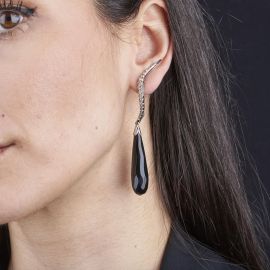in oro bianco 14kt, composti da elementi ondulati impreziositi da diamanti taglio brillante (di cui una pietra sintetica) per ct 1 circa, da cui pendono due ciondoli in pietra nera a forma di lunghe gocce sfaccettate, chiusura a farfallina in oro bianco 18kt, punzone 750, lungh. cm 8, gr. 16 complessivi