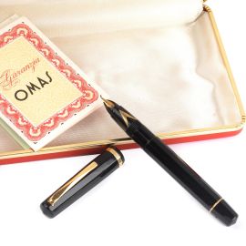 Una penna Omas Extra 555F dal fusto faccettato in resina nera, dettagli di finitura in metallo dorato, decorazione a motivo greco, firmata Omas. Corredata di scatola e garanzia.