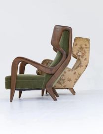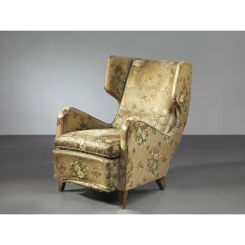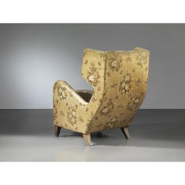 This armchair made with a wooden frame and upholstered in silk has the same proportions and dimensions (except for the inclination of the backrest, probably due to the construction of the frame) as the seat published by Irene de Guttry and Maria Paola Maino in the volume "Il mobile italiano degli anni '40 e '50" on p. 234 in the section dedicated to Gio Ponti, the image comes from volume 35 of Edilizia Moderna magazine. The object we propose also has the same "windows" in the side structure as well as the same thickness of the wooden frame, like a "dressed" version of the published model.