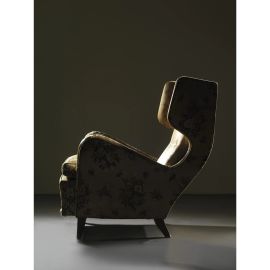 Questa poltrona realizzata con un telaio in legno e rivestita in seta ha le stesse proporzioni e dimensioni (fatta eccezione per l'inclinazione dello schienale, probabilmente dovuta alla costruzione della struttura) della seduta pubblicata da Irene de Guttry e Maria Paola Maino nel volume "Il mobile italiano degli anni '40 e '50" a pag. 234 nella sezione dedicata a Gio Ponti, l'immagine proviene dal volume 35 della rivista Edilizia Moderna. L'oggetto da noi proposto presenta inoltre le stesse "finestre" nella struttura laterale così come lo stesso spessore del telaio in legno, come una versione "vestita" del modello pubblicato.