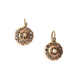 in oro a basso titolo, impreziositi da microperle, mis. anello 11/51, dim. orecchini cm 1x1,5, chiusura a monachella, gr. 5 complessivi