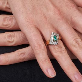 in oro giallo e bianco 18kt, impreziosito al centro da uno smeraldo taglio baguette di ct 0.40 circa, circondato da diamanti taglio brillante per ct 0.20 circa, punzone 750, mis. 12/52, gr. 9