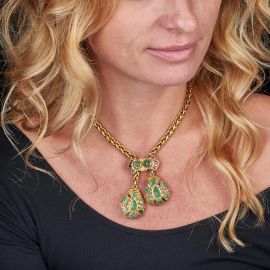in oro giallo 18kt, catena realizzata con maglie a spiga, all'estremità due pendenti decorati in smalto (difetti) uniti da un elemento centrale impreziositi da rubini e smeraldi taglio fantasia, punzone 750, lugh. cm 38,5, gr. 80