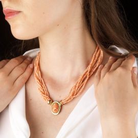 composta da sette fili di sfere in corallo rosa di mm 2 circa, con pendente centrale e fermatura in oro giallo 18kt, lungh. cm 44,5, gr. 48
