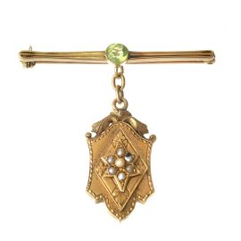 in oro a basso titolo, di cui una a barretta con pendente di dim. cm 4,5x4 circa, accompagnata da una seconda spilla a forma di corno con pietre dure di dim. cm 3x2 circa, gr. 12 complessivi