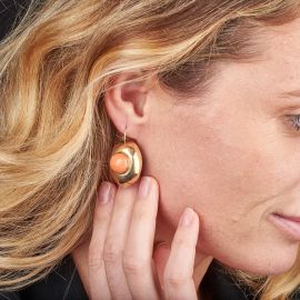 in oro giallo 18kt, di forma ovale, con al centro due boules in corallo rosa di mm 11 circa, chiusura a monachella, dim. cm 2x4 circa, gr. 10 complessivi