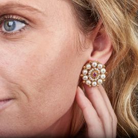 in oro giallo 18kt, di forma circolare, impreziositi al centro da due rubini taglio ovale per ct 0.40 circa, circondati da una doppia fila di perle e microperle, punzone 750, chiusura a clip con perno, dim. cm 2,5x2,5, gr. 19 complessivi