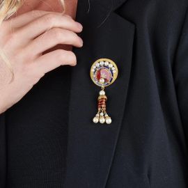 in oro giallo 18kt, decorata in smalti policromi, impreziosita da perle di mm 5 e mm 3 circa, dim. cm 3x7 circa, gr. 21