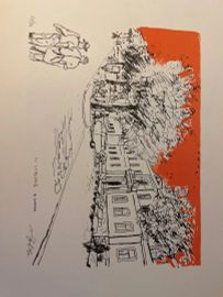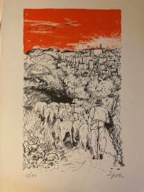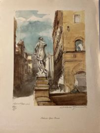 Lot consisting of 5 watercolor engravings depicting Monte Argentario by the painter Alfredo Fabbri; 11 original lithographs depicting Sorano by the painter Alfredo Fabbri and a photolithograph from the watercolor by Luciano Guarnieri depicting Palazzo Spini Feroni