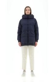 Giacca con cappuccio di colore blu, realizzata in microfibra di nylon riciclato 6.6 con trattamento idrorepellente.
