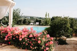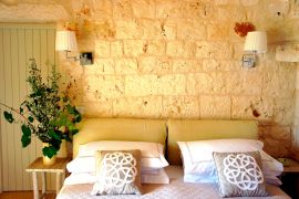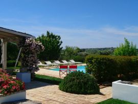 La villa è immersa nella campagna di ulivi e quercete con giardino e piscina, è composta da una lamia con soggiorno, cucina, patio e stanza lavanderia con bagno, camera matrimoniale con bagno en-suite; attigui alla lamia si trovano i trulli con due camere di cui una matrimoniale e una più piccola con letto alla francese entrambe con bagno privato en-suite e accesso indipendente al giardino che offre una piacevole area relax con divani fronte piscina e un'area pranzo al fresco per godere di cene all'aperto; le camere sono dotate di aria condizionata, riscaldamento a pavimento e wifi. In data da concordare con almeno un mese in anticipo.