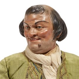 testa in terracotta policroma, mani e piedi in legno dipinto, occhi in vetro, manichino in fil di ferro ricoperto di stoppa, con porro sulla guancia, in abiti da festa, con giacca verde e gilet turchese ornati in oro, pantaloni in seta marrone e fusciacca rossa a cingere la vita, fazzoletto bianco al collo, alt. cm 40,5 (esclusa base)