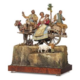 teste in terracotta policroma, mani e piedi in legno dipinto, occhi in vetro, manichino in fil di ferro ricoperto di stoppa, raffigurante contadini festanti su un carro trainato da un mulo. Composto da: contadino abbigliato con panciotto celeste, giacca, gilet e pantaloni crema con calzettoni a righe e tracolla, alt. cm 22, in sella a un cavallo in terracotta, alt. cm 18, trainante carro in legno, cm 31x38x14; giovane contadino in abiti da festa con gilet, giacca e pantaloni crema ornati in oro, regge tra le mani un mazzo di cipolle in porcellana, alt. cm 20; contadina in abiti da festa, con bustino rosso e gonna celeste ornati in oro e passamaneria, grembiule in seta a cingere la vita, nastro turchese a raccogliere i capelli, alt. cm 24; contadina in abiti da festa, con bustino giallo e gonna turchese ornati in oro, passamaneria e fiocchi, grembiule in seta a cingere la vita, alt. cm 23,5; contadino seduto su ceste in vimini, abbigliato con panciotto verde, gilet in lana bianca e pantaloni ocra, alt. cm 22. Accessori in ceramica: mazzo di carote, rape bianche, cavolo nero, limoni; animali in terracotta policroma: maialino, cane e pecora. Custodito entro teca in plexiglass, cm 52x41x26,5 complessivamente