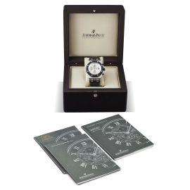 cassa in acciaio, fondello serrato con viti, lunetta in caucciù con viti, pulsanti e corona marcata rivestiti in gomma nera, quadrante bianco con contatori cronografici argentè e scala tachimetrica sul disco rehaut, indici applicati con luminova, datario a ore tre con lente di ingrandimento, movimento a carica automatica, cinturino originale in caucciù nero, lungh. interna cm 20, chiusura deployant in acciaio marcata AP, vetro minerale. Diam. mm 42. Corredato di scatola, controscatola, garanzia e astuccio service.