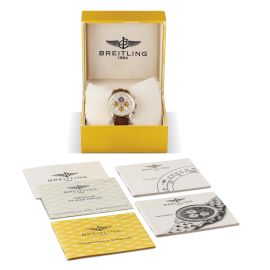 cassa in acciaio, fondello serrato a vite, tasti del crono a pompa, corona marcata, ghiera zigrinata placcata in oro, quadrante argentè con scala telemetrica sul disco rehaut girevole, grafica nera e rosso, logo United States Navy Fighter Weapons School, numeri arabi stampati e applicati, tre contatori a contrasto, secondi a ore tre, movimento a carica automatica cal ETA 2892A2, cinturino originale in pelle marrone, fibbia in metallo marcata Breitling, vetro plastica. Diam. mm 38. Corredato di scatola e garanzia.