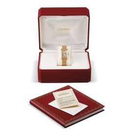 cassa di forma rettangolare in oro giallo 18kt, fondello serrato con viti, lunetta liscia in oro giallo, corona con zaffiro sfaccettato, quadrante argentè, grafica nera, numeri romani a smalto, movimento al quarzo, bracciale a maglie in oro giallo 18kt, lungh. interna cm 17, chiusura doppia deployant in oro giallo marcata Cartier, vetro minerale, gr. 82. Dim. mm 19x35. Corredato di scatola e garanzia.