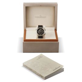 cassa in acciaio, fondello serrato con viti con disco centrale in oro rosa, quadrante nero, grafica bianca, indici e numeri arabi applicati con superluminova, datario a ore tre, corona per rimessa dell'ora a ore quattro, corona per rimessa della sveglia a ore due, corona per rotazione disco interno a ore dieci, movimento a carica automatica, cinturino non originale in pelle nera, chiusura deployant in acciaio marcata Jaeger Le Coultre, vetro minerale. Diam. mm 41. Corredato di scatola e controscatola.