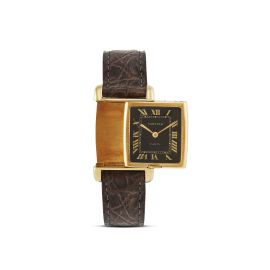 cassa di forma in oro giallo 18kt con sistema a scorrimento e alloggio in oro giallo, corona di carica a ore dodici, quadrante giorno in smalto bianco (difetti), grafica nera con numeri romani a smalto, secondo quadrante in smalto nero, grafica oro con numeri romani, movimento a carica manuale, cinturino originale in pelle marrone e fibbia in oro giallo 18kt marcata Cartier, lungh. interna cm 18, vetro plastica, gr. 53. Dim. mm 23x37