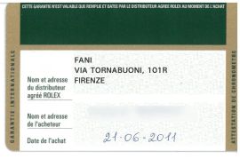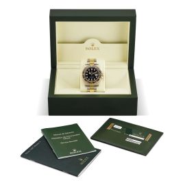 cassa in acciaio, fondello serrato a vite, corona marcata, ghiera in oro giallo con inserto nero in ceramica, quadrante nero con bicchierini al superluminova, datario a ore tre con lente cyclope, movimento a carica automatica, bracciale oyster a maglie piene in acciaio e oro, lungh. interna cm 20, cod. produzione 076, chiusura a scatoletta marcata Rolex, vetro minerale. Diam. mm 40. Corredato di scatola, controscatola, garanzia, libretti e una maglia aggiuntiva.
