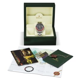 cassa in acciaio, fondello serrato a vite, ghiera in acciaio con inserto "Pepsi", grafica bianca, quadrante nero con bicchierini al superluminova, datario a ore tre con lente cyclope, movimento a carica automatica, bracciale oyster a maglie piene in acciaio ref. 78790A, lungh. interna cm 20, cod. produzione MA6, chiusura a scatoletta marcata Rolex, vetro minerale. Diam. mm 40. Corredato di scatola, controscatola, garanzia, libretto e seconda ghiera "Coke".