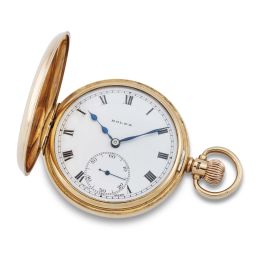 cassa in tre parti in oro giallo 9kt, fondello interno recante personalizzazione con dedica, punzoni 9kt, del fabbricante e S.A.R., coperchio a "occhio di bue" con numeri romani, quadrante bianco in porcellana, lancette a foglia, numeri romani a smalto, secondi a ore sei, movimento a carica manuale, gr. 94. Diam. mm 48