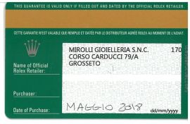 cassa in acciaio, fondello a vite, corona marcata, ghiera girevole con inserto in ceramica nera, quadrante nero, grafica bianca, indici bicchierini al luminova, datario a ore tre con lente cyclope, movimento a carica automatica, bracciale oyster in acciaio a maglie piene, cod. produzione 6UT, lungh. interna cm 20, chiusura a scatoletta in acciaio marcata Rolex, vetro minerale. Diam. mm 40. Corredato di scatola, controscatola, garanzia e due maglie aggiuntive.