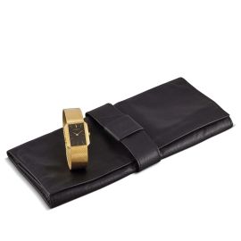 cassa di forma in oro giallo 18kt, fondello serrato con viti, quadrante nero, grafica oro, indici applicati, movimento a carica manuale cal 1003 n. 661768, bracciale integrato in oro giallo 18kt, lungh. cm 18,5, chiusura a scomparsa in oro giallo marcata Vacheron Constatin, vetro minerale, gr. 88. Dim. mm 25x28. Corredato di astuccio in pelle.
