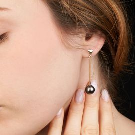 in oro bianco 18kt, da cui pendono due perle grige di mm 9 circa, chiusura a farfallina, lungh. cm 4, gr. 6 complessivi. Corredati di catalogo biografico.