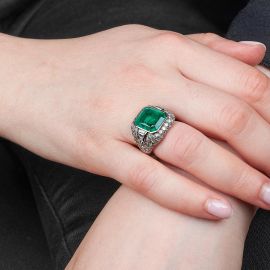 in oro bianco 18kt, impreziosito al centro da uno smeraldo taglio ottagonale di ct 4.70 circa, circondato da diamanti taglio vecchio e baguette per ct 2.50 circa, mis. 11/51, gr. 10