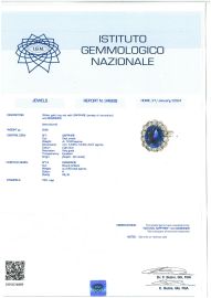 in oro bianco 18kt, al centro uno zaffiro ceylon taglio ovale di ct 10 circa, circondato da una fila di diamanti taglio brillante per ct 2.80 circa, punzone 750 e logo, mis. 19/59, gr. 8. Corredato di certificato IGN del 31/01/2024 attestante l'origine della pietra e l'assenza di trattamenti termici.