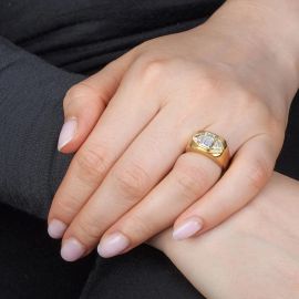 in oro giallo 18kt, al centro un diamante taglio rettangonale di ct 2 circa circa, affiancato da due diamanti taglio trilliant per ct 0.40 circa, punzone 750, mis. 10/50, gr. 7