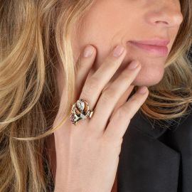in oro giallo, bianco e rosa 14kt, realizzato a forma di fiore, impreziosito da diamanti taglio antico per ct 0.80 circa e rubini taglio rotondo per ct 0.40 circa, punzone 14kt, mis. 15/55, gr. 14