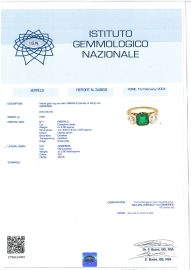 in oro giallo 18kt, al centro uno smeraldo colombiano taglio ottagonale di ct 2.30 circa, affiancato da due diamanti taglio vecchio per ct 2.50 circa, mis. 14/54, gr. 5. Corredato di certificato IGN del 13/02/2024 attestante le caratteristiche e l'origine della pietra.