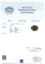 in oro giallo 18kt, impreziosito al centro da uno zaffiro taglio ovale di ct 3.60 circa, circondato da smeraldi taglio rotondo per ct 0.50 circa e diamanti taglio brillante per ct 1 circa, mis. 12/52, gr. 13. Corredato di certificato IGN del 08/04/2024 attestante l'origine della pietra e l'assenza di trattamenti termici.