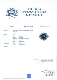 in platino, al centro uno zaffiro ceylon taglio ovale di ct 6.20 circa, circondato da diamanti taglio huit huit per ct 0.20 circa, mis. 11/51, gr. 5. Corredato di certificato IGN del 03/07/2020 attestante l'origine geografica della pietra e l'assenza di trattamenti termici.