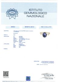 in oro bianco 18kt, impreziosito al centro da uno zaffiro ceylon taglio ovale di ct 8.50 circa, affiancato da diamanti taglio smeraldo per ct 0.50 circa, mis. 19/59, gr. 6. Corredato di certificato IGN del 13/03/2024 attestante l'origine geografica della pietra e l'assenza di trattamenti termici.
