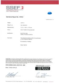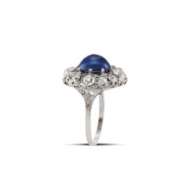 in platino, impreziosito al centro da uno zaffiro taglio cabochon di ct 4.21, circondato da diamanti taglio antico per ct 1.40 circa, mis. 12/52, gr. 5. Corredato di certificato SSEF del 15/03/2024 e IGN del 13/02/2024 attestante l'origine geografica della pietra e l'assenza di trattamenti termici.