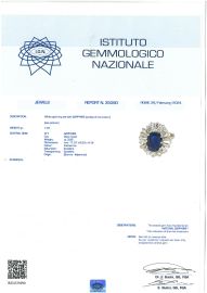 in oro bianco 18kt, al centro uno zaffiro taglio ovale di ct 3.95, circondato da diamanti taglio brillante e tapes per ct 2.50 circa, punzone 750, mis. 12/52, gr. 7. Corredato di certificato IGN del 26/02/2024 attestante l'origine geografica della pietra e l'assenza di trattamenti termici.