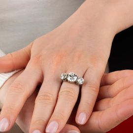 in oro bianco 18kt, impreziosito da un diamante centrale taglio antico (smontato) di ct 3.02, affiancato da due diamanti taglio antico per ct 2.20 circa, punzone 750, mis. 9/49, gr. 5