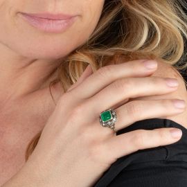 in oro e argento, impreziosito al centro da uno smeraldo taglio ottagonale di ct 2.10 circa, circondato da diamanti taglio huit huit per ct 0.15 circa, firmato "M.Buccellati", punzone 750, mis. 11/51, gr. 4