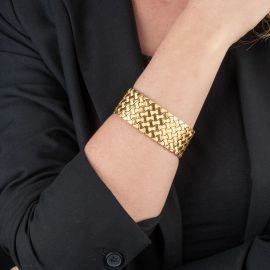 in oro giallo satinato 18kt, realizzato a maglia tessita, firmato "M.Buccellati", punzoni 750 e del fabbricante, lungh. cm 18, 5, gr. 97