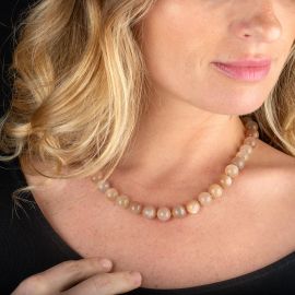 composta da un filo di sfere in calcedonio di mm 10 circa, fermatura a sfera in oro giallo 18kt satinato e firmata "Federico Buccellati", punzone 750, lungh. cm 47, gr. 70. corredata di astuccio.