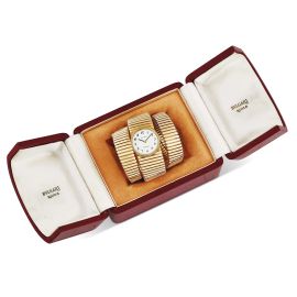 cassa in oro giallo 18kt, quadrante bianco, firmato "Movado" e "Bulgari", numeri arabi stampati, movimento a carica manuale, bracciale tubogas in oro giallo 18kt firmato "Bulgari", punzone 750, circonferenza cm 15 circa, gr. 168. Corredato di scatola.