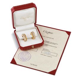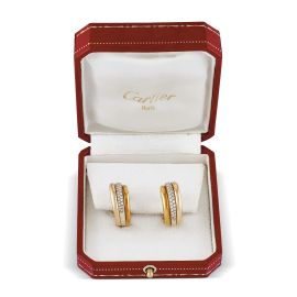 in oro giallo, rosa e bianco 18kt, con fascia centrale impreziosita da diamanti taglio brillante per ct 0.70 circa, firmati "Cartier", punzoni 750, del fabbricante e numero seriale, chiusura a clip con perno, dim. cm 1x2x2 circa, gr. 22 complessivi. Corredati di scatola.