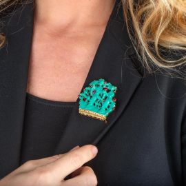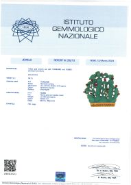 in oro giallo 18kt e turchese intagliato, raffigurante due figure femminili circondate da fiori, impreziosita da rubini birmani taglio fantasia per ct 0.80 circa, punzoni 750 e logo di Angelo Giorgio Cazzaniga, dim. cm 5x4,5 circa, gr. 30. Corredata dicertificato IGN del 13/03/2024 attestante le caratteristiche e l'assenza di trattamenti.