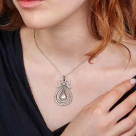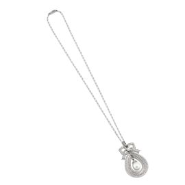 in oro bianco 18kt, da cui pende un ciondolo a forma di fiocco in platino impreziosito da una perla naturale centrale di mm 5.52/8.36x9.50 circa, lungh. cm 40, dim. pendente cm 2,5x4,5, gr. 15 complessivi. Corredata di certificato IGN del 08/04/2024 attestante le caratteristiche.